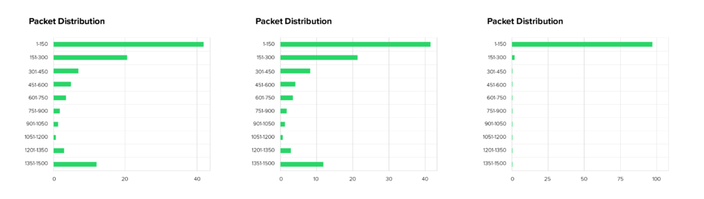 - Paketgrößen: Die Verteilung war ungewöhnlich gemischt. Statt ausschließlich kleiner Fragmente tauchten unterschiedlich große Pakete auf. Dies lässt auf verschiedene Angriffs-Tools oder Botnet-Komponenten schließen.