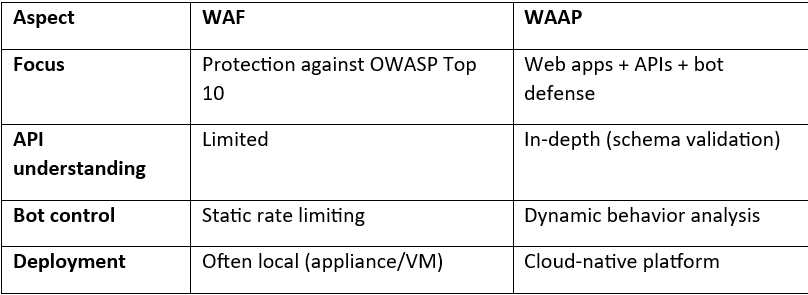 - WAF filters patterns → WAAP evaluates behavior.