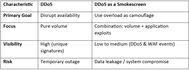 - The noise: A massive DDoS attack creates operational chaos, floods monitoring systems with alarms, and inflates log files enormously.