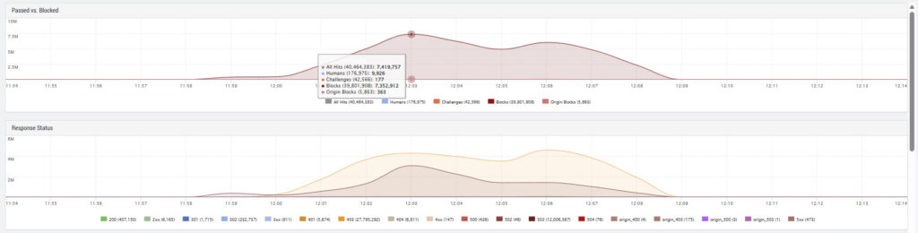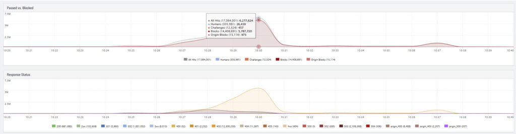 Such attacks are loud and highly visible. They are designed to tie up or completely overwhelm backend resources. Without upstream protection mechanisms, a botnet of this size can push critical applications to their limits and cause massive outages.